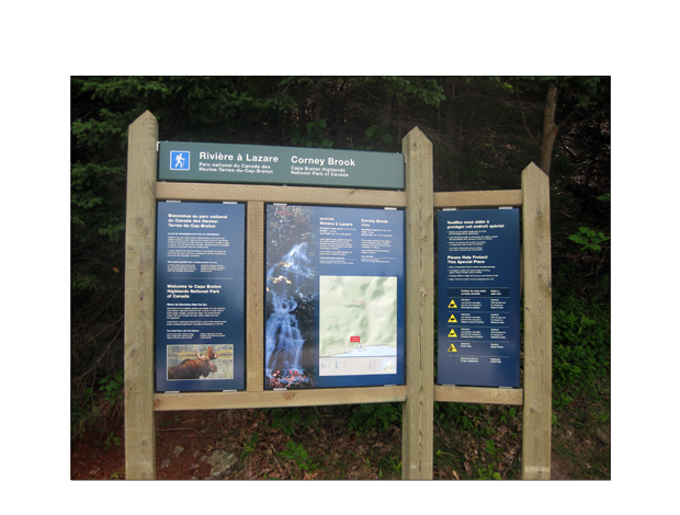 | Description | Trailhead system in the ground — Corney Brook Trail with a variation on layout of Orientation panel design based on the orientation of the selected photograph Integrated National Park Trailhead Orientation signage system and design for Cape Breton Highlands National Park of Canada in Nova Scotia. |